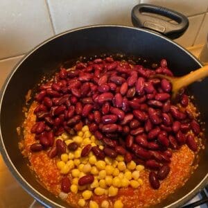 Úplne na záver do zmesi pridáme scedenú a pod tečúcou vodou dôkladne prepláchnutú fazuľu s cícerom. Všetko premiešame a necháme ešte asi 5 minút povariť, aby sa chute krásne prepojili, pričom podľa potreby jedlo nakoniec dochutíme soľou.