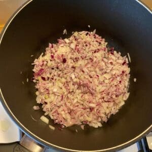 Vo veľkom hrnci necháme zovrieť 8 PL vody a pridáme do nej nadrobno nakrájanú cibuľu, následne premiešame. Keď začne obsah vrieť, hrniec prikryjeme pokrievkou, stíšime plameň a cibuľu necháme dusiť 7 minút.